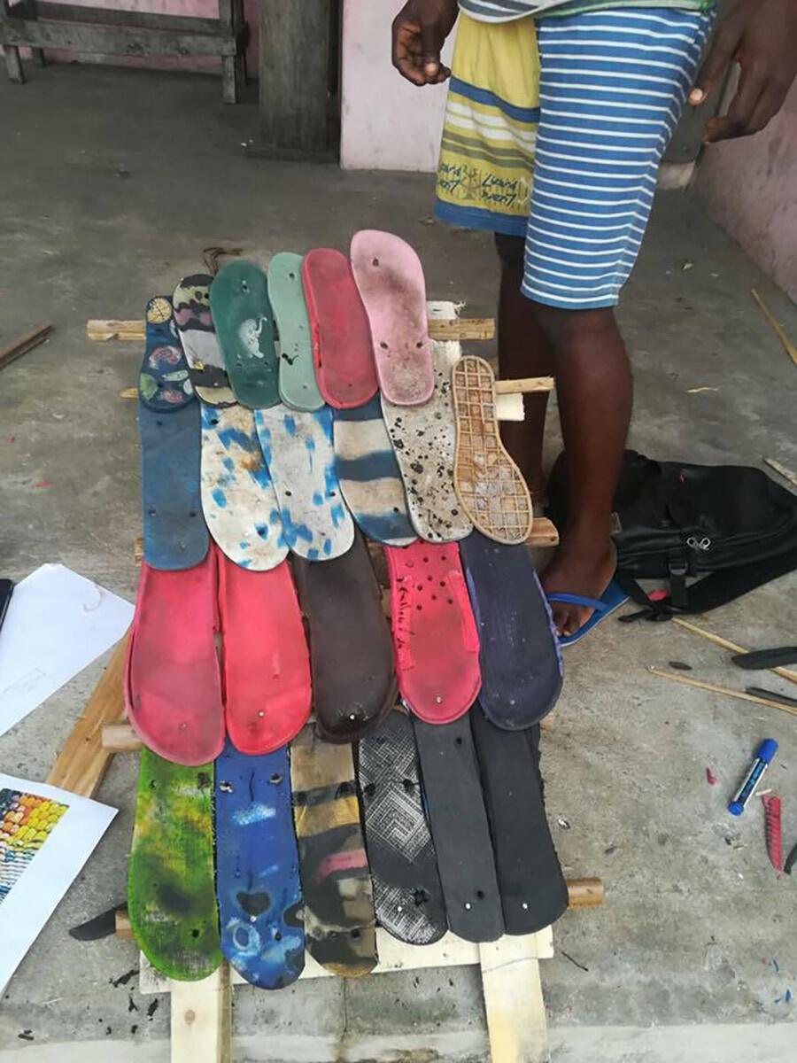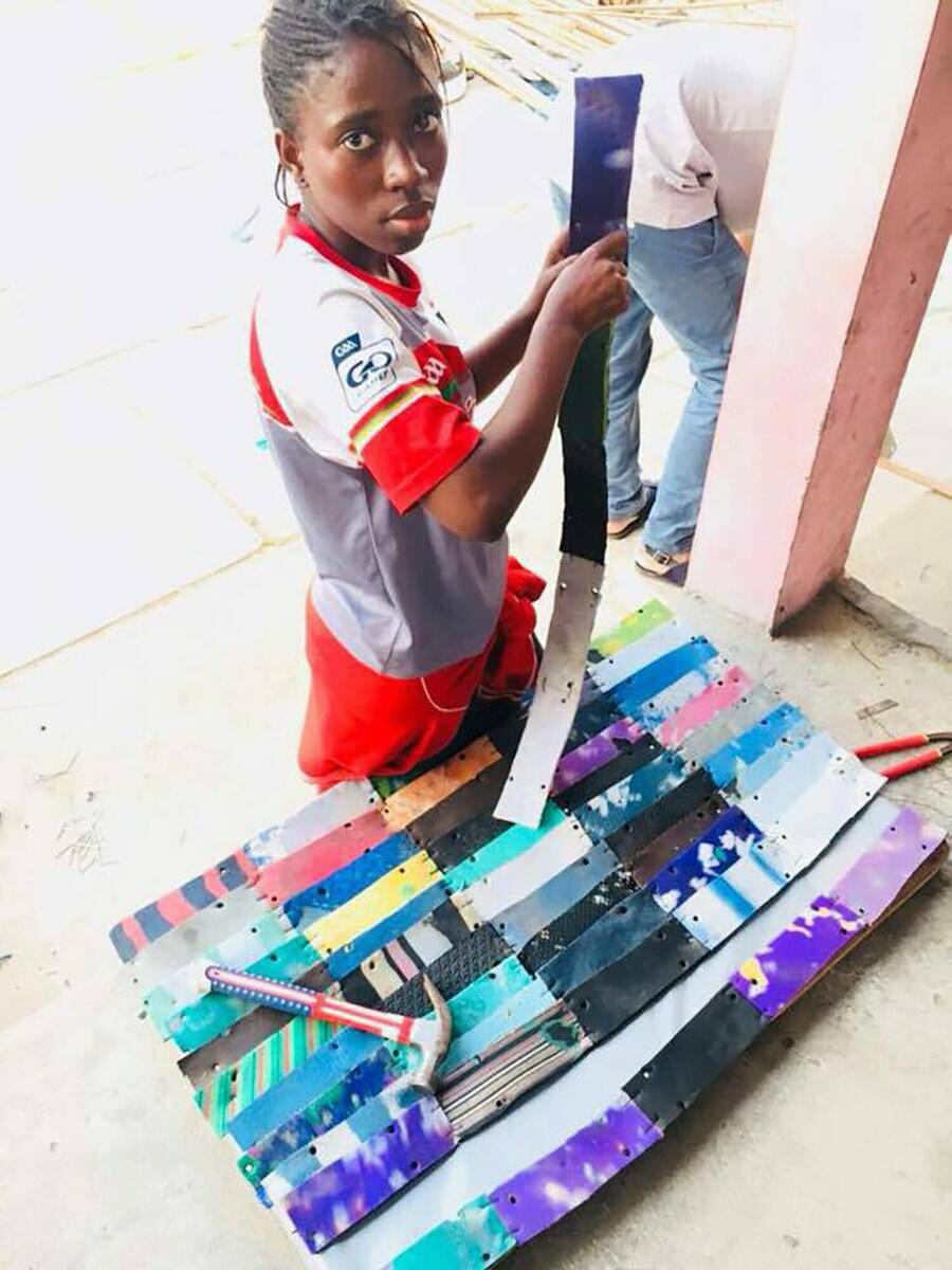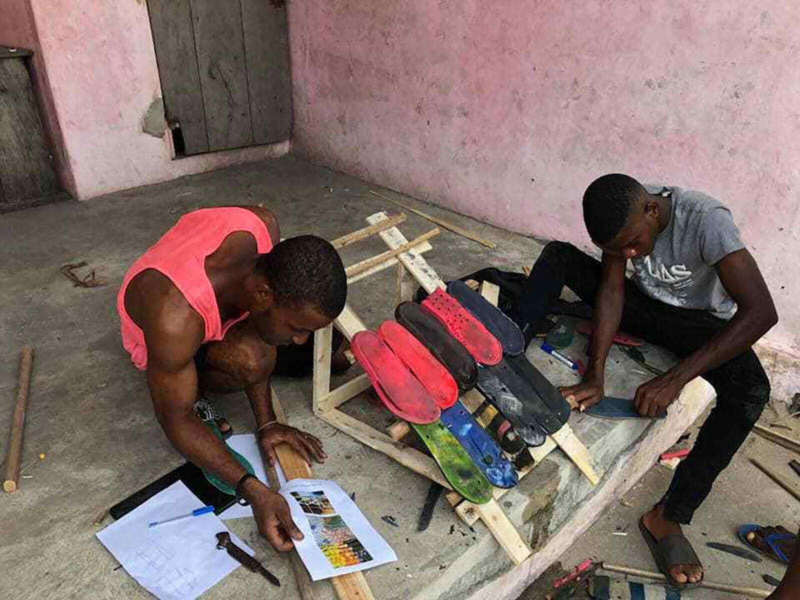 Designer étrangère du pays et du quartier d’Akpakpa Dodomey Enagnon, la première chose à faire a été de déambuler avec les Griots à travers les vons du quartier, observer sa tectonique, faire connaissance avec ses habitants en rentrant dans les cours des maisons, ressentir la vie (Vauthrin, 1989) et identifier les ressources disponibles. Lors d’un second atelier, une collecte de matières au sol, dans la rue comme sur la plage, a permis aux Griots de créer la matériauthèque d’Akpakpa Dodomey Enagnon, pour ensuite imaginer les potentiels de ces matières en projetant d’autres utilisations. La semelle de tong, utilisée pour marcher car résistante et imperméable, a ainsi été explorée en matériau de sous-toiture, grâce à un matériel rudimentaire de bricolage. Cette solution, parmi d’autres prototypées, sont destinées à changer d’échelle afin d’intégrer le grand projet de construction de la Maison du Peuple (actuellement une cour publique délaissée). Entièrement co-conçu avec les habitants du quartier, ce bâtiment permettra d’offrir l’accès à un espace d’expression artistique, une bibliothèque, un potager hors-sol et un espace polyvalent de réunion.