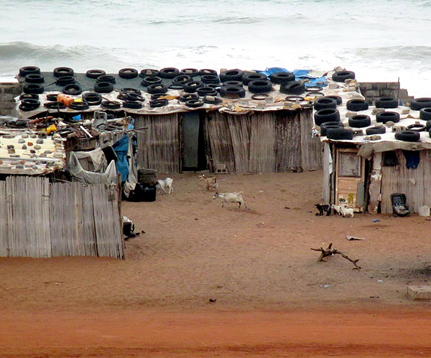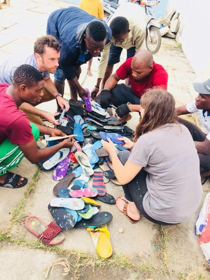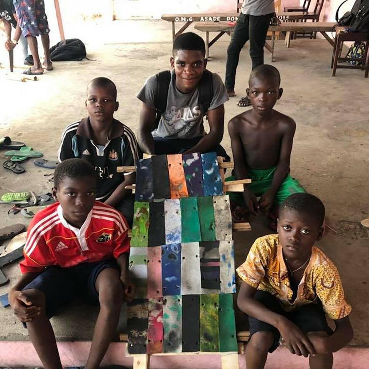 Designer étrangère du pays et du quartier d’Akpakpa Dodomey Enagnon, la première chose à faire a été de déambuler avec les Griots à travers les vons du quartier, observer sa tectonique, faire connaissance avec ses habitants en rentrant dans les cours des maisons, ressentir la vie (Vauthrin, 1989) et identifier les ressources disponibles. Lors d’un second atelier, une collecte de matières au sol, dans la rue comme sur la plage, a permis aux Griots de créer la matériauthèque d’Akpakpa Dodomey Enagnon, pour ensuite imaginer les potentiels de ces matières en projetant d’autres utilisations. La semelle de tong, utilisée pour marcher car résistante et imperméable, a ainsi été explorée en matériau de sous-toiture, grâce à un matériel rudimentaire de bricolage. Cette solution, parmi d’autres prototypées, sont destinées à changer d’échelle afin d’intégrer le grand projet de construction de la Maison du Peuple (actuellement une cour publique délaissée). Entièrement co-conçu avec les habitants du quartier, ce bâtiment permettra d’offrir l’accès à un espace d’expression artistique, une bibliothèque, un potager hors-sol et un espace polyvalent de réunion.