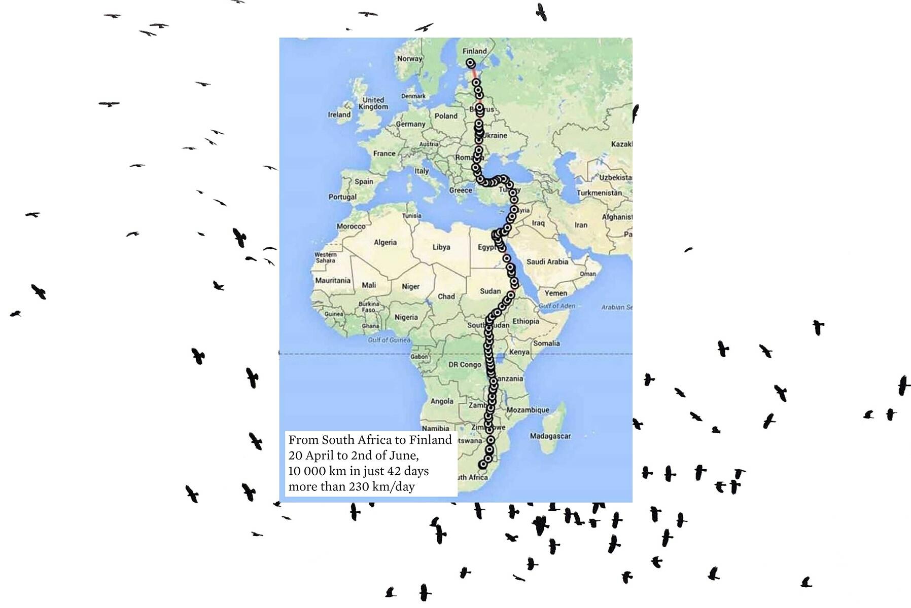 Dans notre imaginaire, la migration de nos compagnons ailés est synonyme d’infinie liberté et de formidables aventures [...] on prend conscience que c’est tellement vrai, et tellement faux à la fois. On ne migre pas pour le plaisir mais par nécessité. L’énergie ainsi dépensée, les trésors d’in- géniosité déployés et le nombre d’embûches auxquelles les oiseaux doivent faire face, forcent notre admiration avec raison »